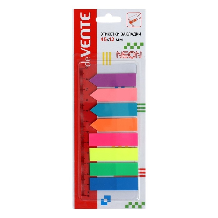 Набор самоклеящихся этикеток-закладок "deVENTE" пластиковые полупрозрачные 45 x 12 мм, 8 x 25 листов, 4 x 25 стрелки, 4 x 25 прямоугольники, 8 неоновых цветов, в картонном блистере