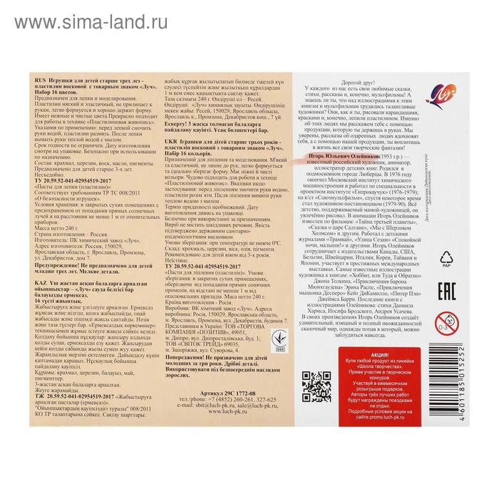 Пластилин мягкий восковой, 16 цветов 240 г "Школа творчества"