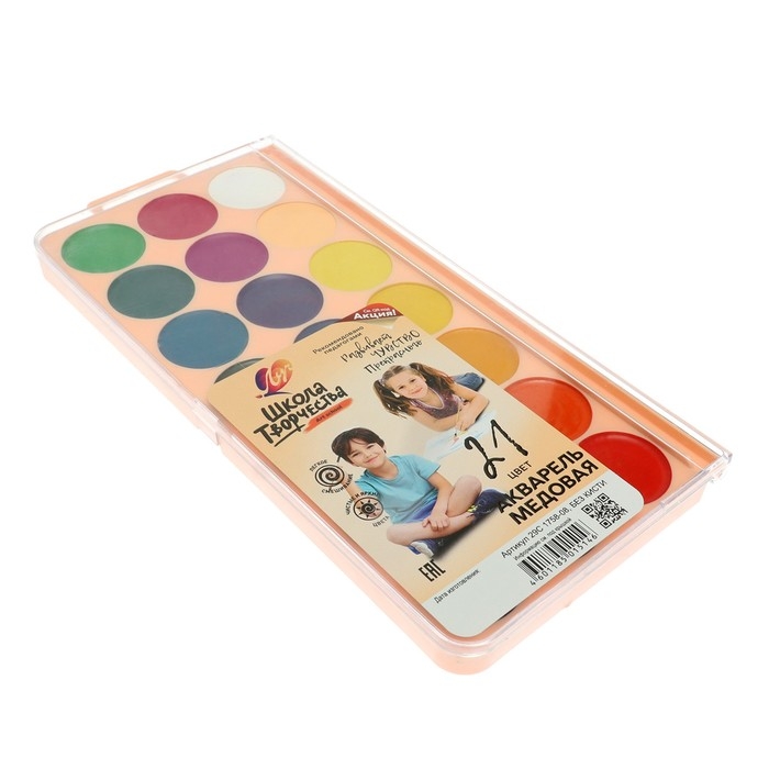 Медовая акварель изготовленная по классической рецептуре с яркими и чистыми цветами. Краска в подложке расположена группами: холодные-тёплые оттенки. Прекрасно размывается и разносится по поверхности бумаги, имея прозрачную основу без вкраплений. Краски смешиваются между собой, сохраняя насыщенность цвета. Краска легко смывается с рук и одежды.