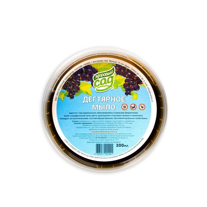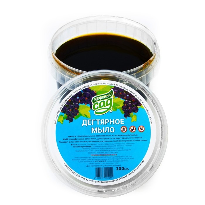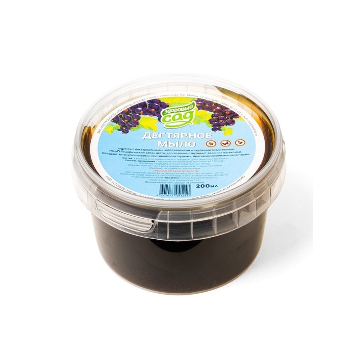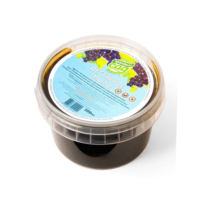 Препарат «Дегтярное мыло» предназначен для защиты растений от вредителей, который предупреждает, уничтожает и отпугивает клещей, гусениц, долгоносиков, пилильщиков, огневок, тлей, трипсов, мух и других вредителей на ягодных кустах, деревьях и декоративных растениях. Носит заслуженный статус «народного средства». Представляет собой густую гелеобразную смесь. Основными ингредиентами являются калийные соли жирных кислот, полученные в результате омыления растительных масел, с добавлением борной кислоты в целях снижения излишней щелочности, а главное -березовый деготь, продукт пиролиза древесины. Деготь - содержит в своем составе органические вещества, такие как бетулин, теребен, гваякол, ксиленоп и др., которые помогают предупредить процессы тиения, некроз растительных тканей, ускорить их рост и укрепить иммунитет растений. Благодаря натуральной основе, этим мылом можно без опаски пользоваться как в саду, так и в бытовых условиях. Действует практически на всех насекомых как сигнал опасности, выработанный в ходе эволюции. Естественная реакция всего живого - самосохранение, поэтому насекомые, учуяв этот запах, стараются быстро покинуть опасную территорию, и не ползти и не лететь в сторону, откуда он распространяется. Огня и сопутствующего его дыма не переносят и смертельно боятся все виды ползающих и летающих насекомых. Как только распространится дымный запах, немедленно начинается бегство вредителей.