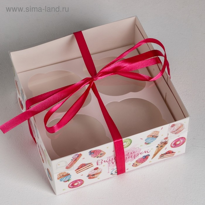 Коробка для капкейков, кондитерская упаковка, 4 ячейки «Вкусный подарок», 16 х 16 х 7.5 см