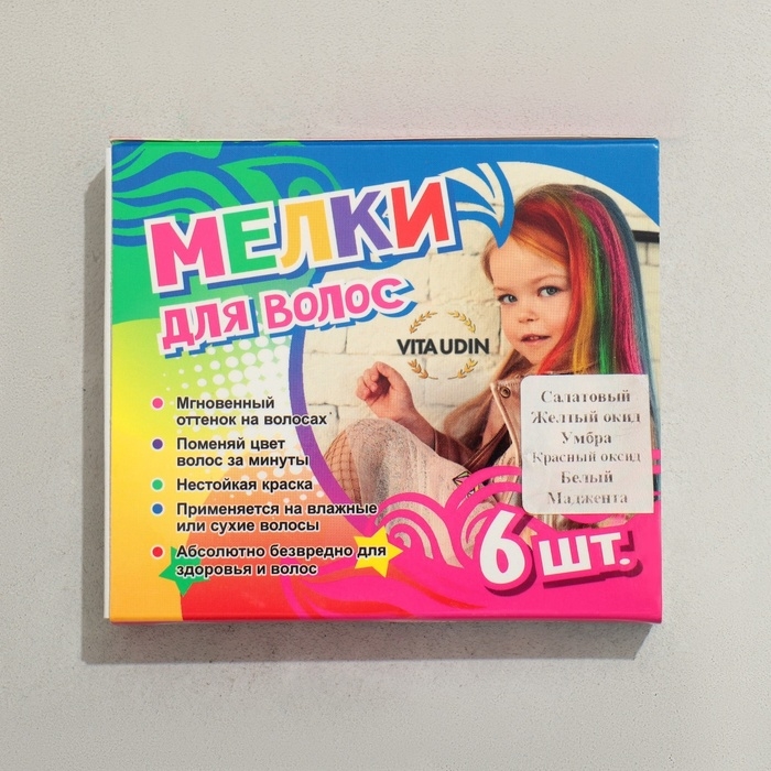 Набор мелков для волос, 6 шт. Цвета: салатовый, желтый, умбра, красный, белый, маджента