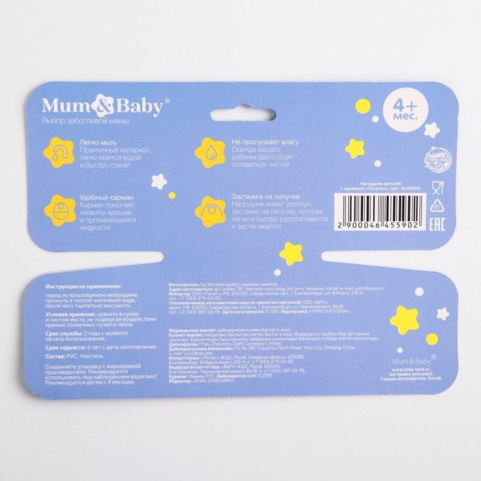 Товар изготовлен из материалов, не содержащего токсичных веществ. После использования мойте тёплой мыльной водой. Нагрудник рекомендован для детей старше 4 месяцев.