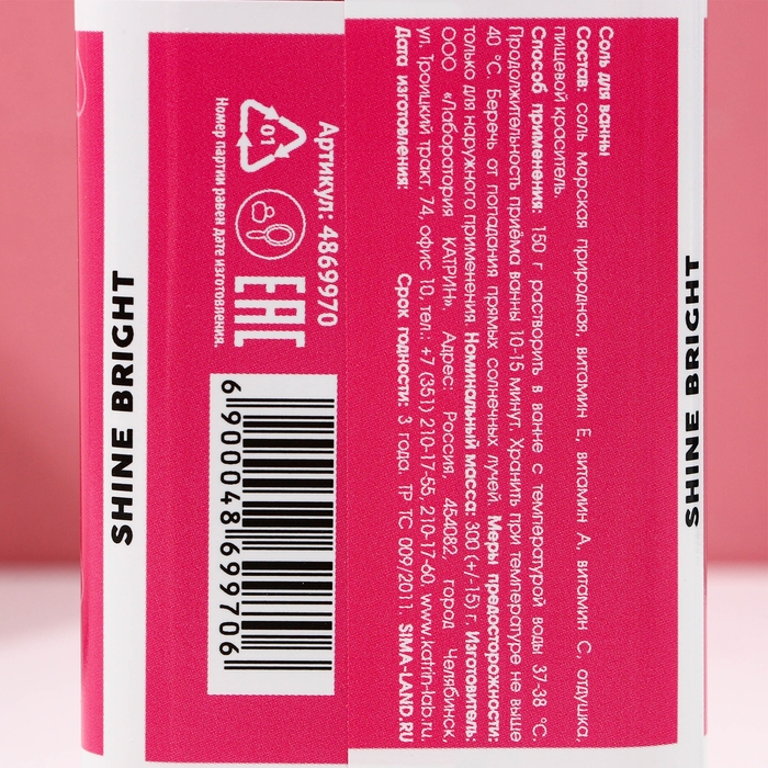 Состав: соль морская природная, витамин Е, витамин А, витамин С, отдушка, пищевой краситель.