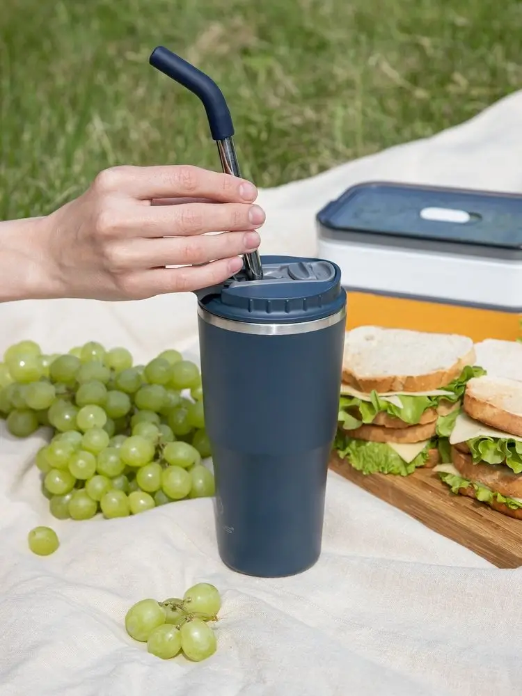 - 2 крышки в комплекте: одна на 100% герметичная с механизмом блокировки отверстия для питья, вторая — с отверстием для трубочки