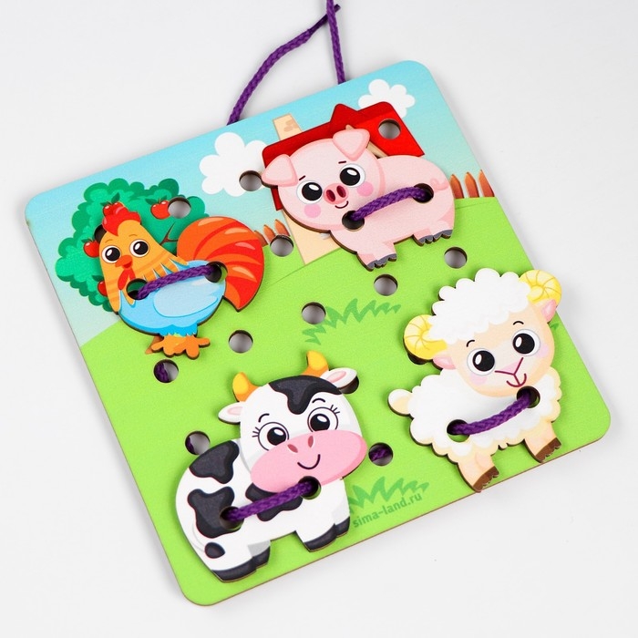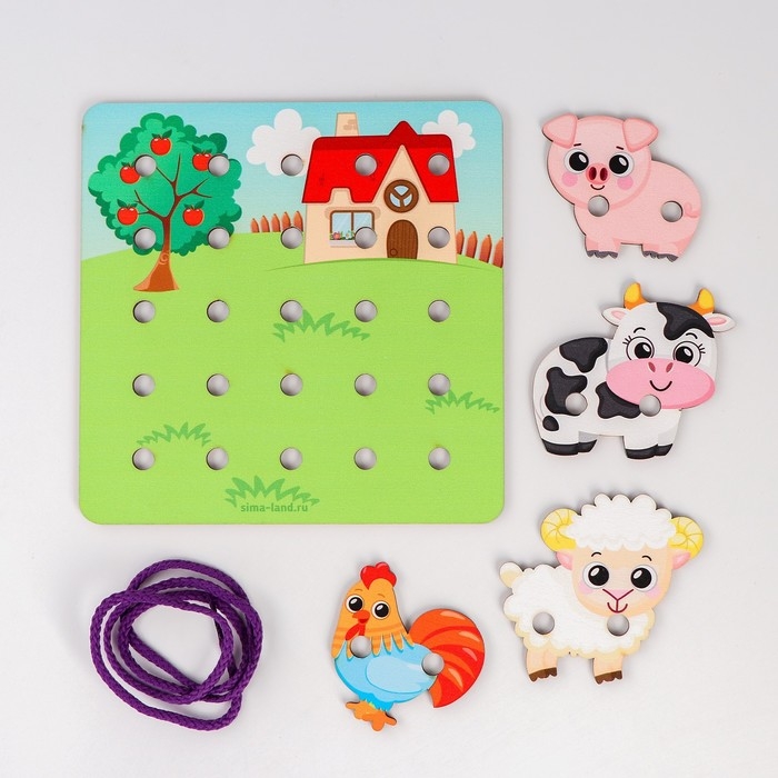 Игрушка-шнуровка в первую очередь направлена на развитие мелкой моторики. Во время игры малыш будет продевать шнурок сквозь отверстия в игровом поле, а также в фигурках. Покажите, что можно делать стежки, а также завязывать и развязывать узелки.Яркие персонажи сделают игру не только развивающей, но и интересной. Придумывайте вместе с ребёнком сюжеты, разыгрывайте истории.