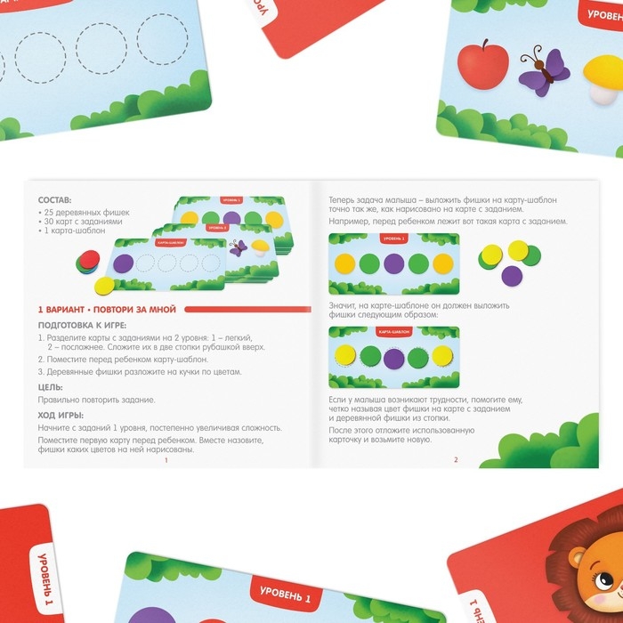 Начните с заданий 1-го уровня, постепенно увеличивая сложность. Поместите первую карту перед ребёнком. Вместе назовите, кружки́ каких цветов на ней нарисованы.