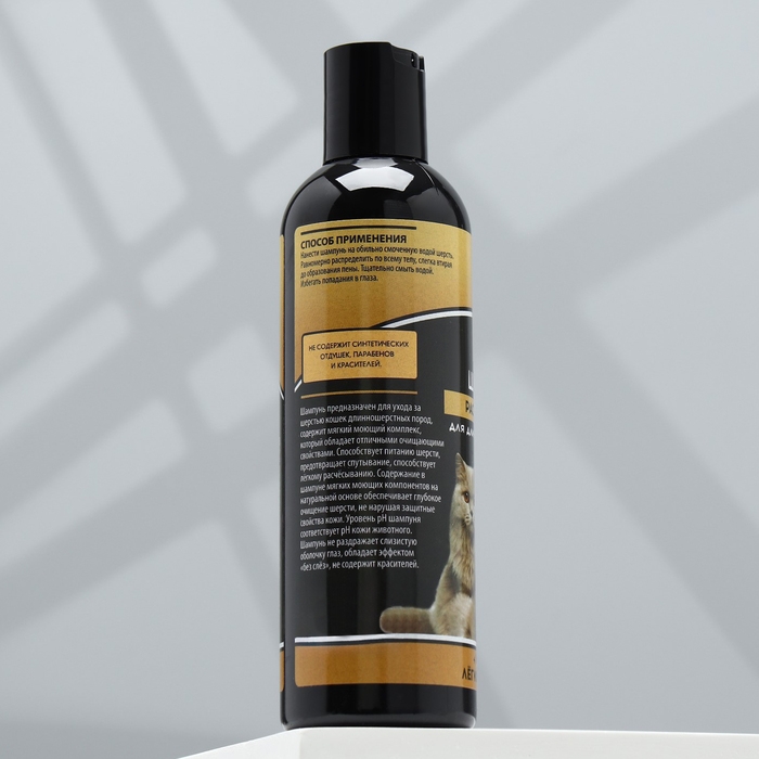 Шампунь предназначен для ухода за шерстью кошек длинношерстных пород, содержит мягкий моющий комплекс, который обладает отличными очищающими свойствами.