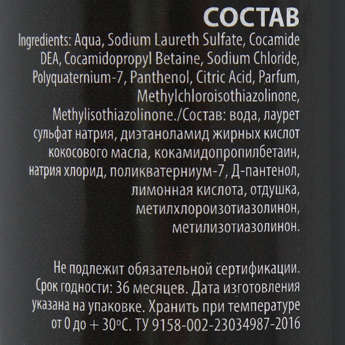 Состав: вода, лаурет сульфат натрия, диэтаноламид жирных кислот кокосового масла, кокамидопропилбетаин, натрия хлорид, поликватерниум-7, Д-пантенол, лимонная кислота, отдушка, метилхлороизотиазолинон, метилизотиазолинон.