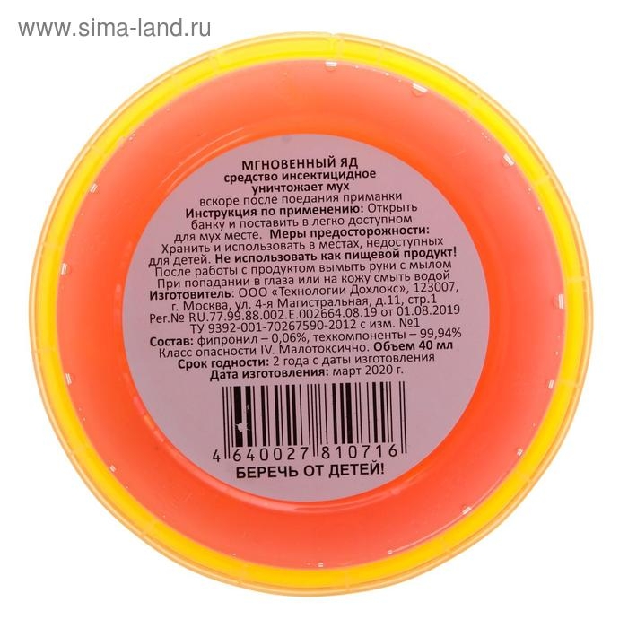 Средство от мух с мгновенным ядом Отравное варенье «Сгинь!» является инсектицидной приманкой для уничтожения мух.Гибель насекомых наступает вскоре после поедания приманки.Откройте банку и поставьте в легкодоступном для мух месте.Осторожно! Хранить и ставить в труднодоступном для детей и домашних животных, месте.Не использовать как пищевой продукт.После работы вымыть руки водой с мылом.При попадание средства в глаза или на кожу, смыть водой.Состав: фипронил – 0,06%, техкомпоненты – 99,94%.Инструкция по применению: открыть банку и поставить в легко доступном для мух месте.