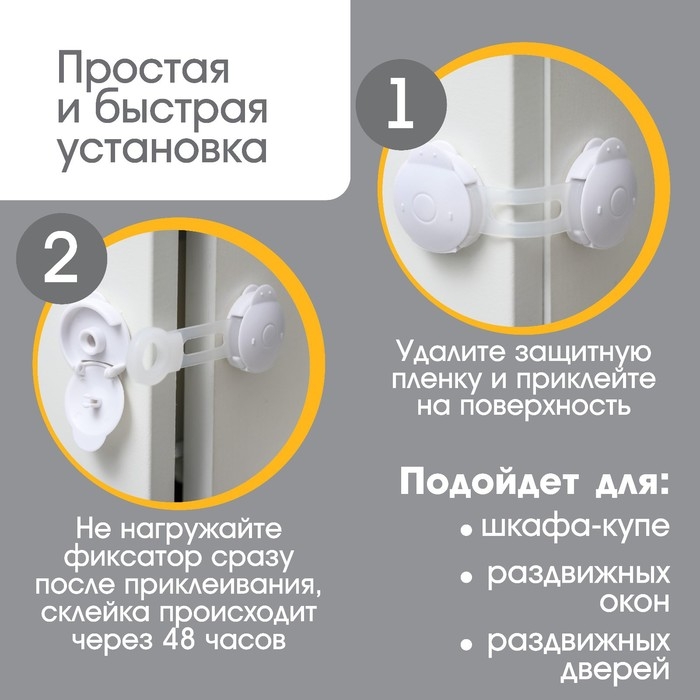 Специальное приспособление сделает для малютки недоступными выдвижные ящики комодов, шкафов, а также крышку унитаза, дверки холодильника, морозильной камеры и микроволновой печи. Благодаря гибкому материалу блокиратор может использоваться на углах и неровных поверхностях. Подходит для стеклянных, ламинированных, пластмассовых и металлических предметов. Изделие состоит из трёх частей: двух дисков-крепежей и гибкого элемента. Легко демонтируется.