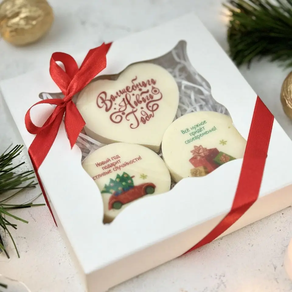 Набор упакован в изящную коробку с подарочной атласной лентой.В набор входят 3 печенья.