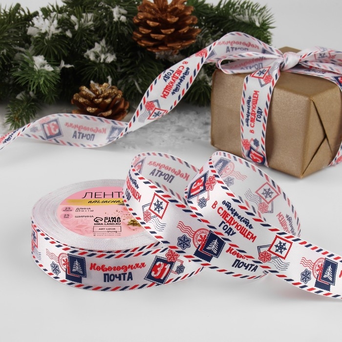 Новый год! Лента атласная «Новогодняя почта», 25 мм, 23 ± 1 м, цвет белый/синий/красный