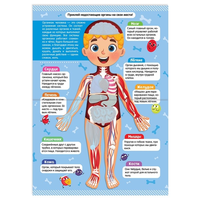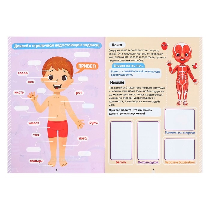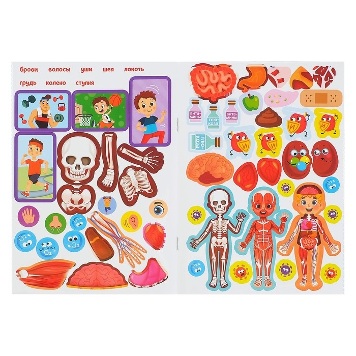 Серия книжек с наклейками познакомит малышей с человеческим телом. Занимаясь с этой книгой, ребёнок узнает, как работают разные органы и системы. А закрепить знания помогут весёлые и интересные задания: их нужно выполнить с помощью наклеек.