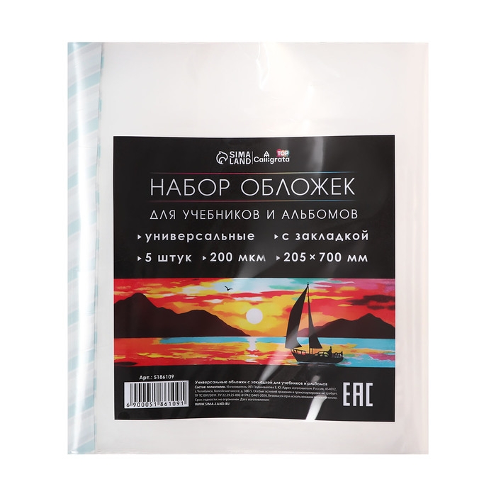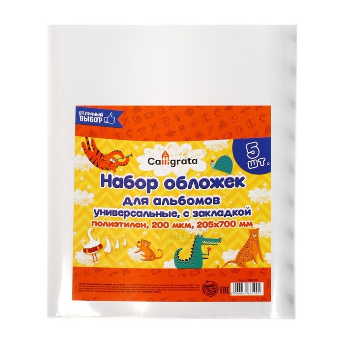 Набор обложек ПЭ 5 штук, 205 х 700 мм, 200 мкм, для альбомов и учебников, универсальная, с закладкой, МИКС