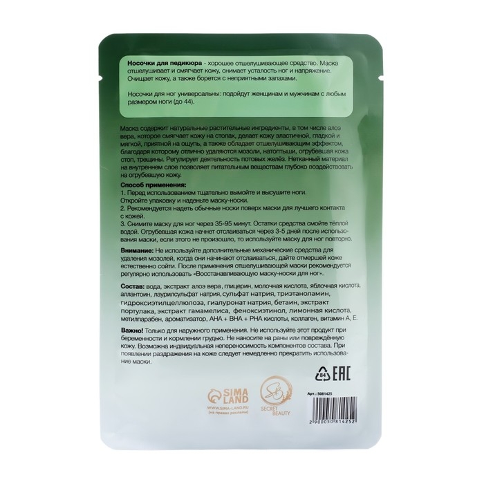 - Рекомендуется надеть обычные носки поверх маски для лучшего контакта с кожей. Снимите маску для ног через 35-95 минут. Остатки средства смойте тёплой водой.