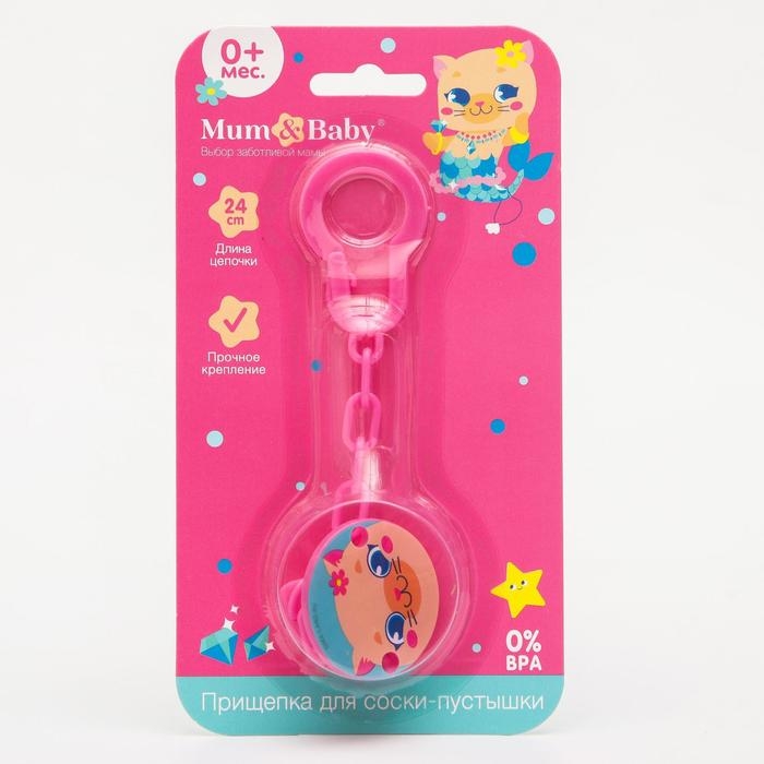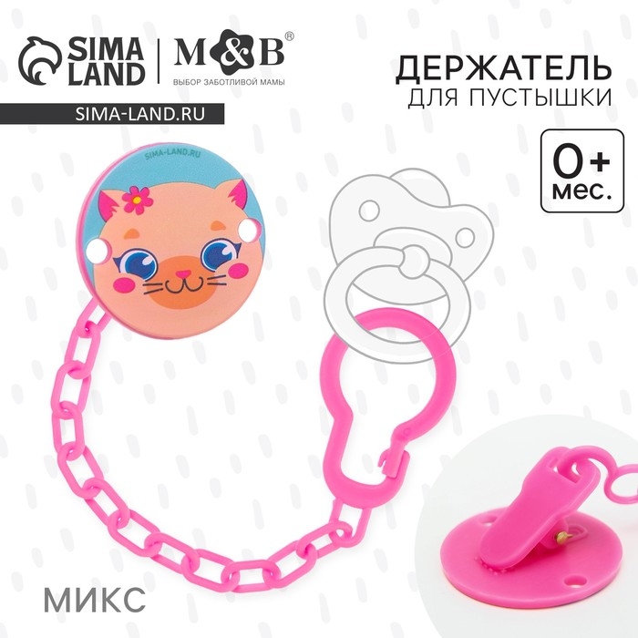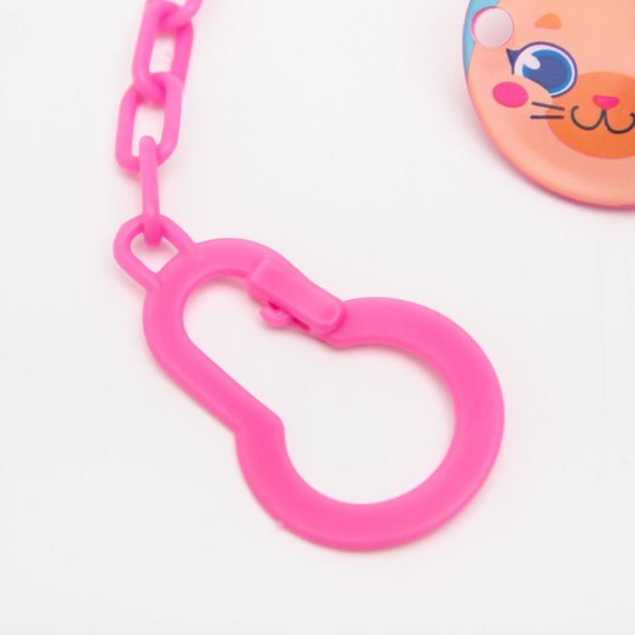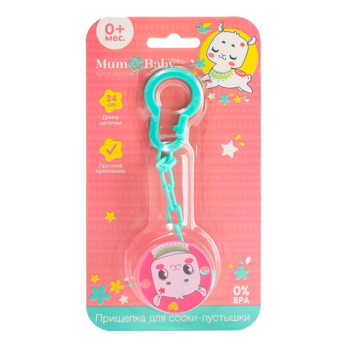 Изделие фиксируется на одежде ребёнка. На конце цепочки есть карабин, который зацепляется за кольцо пустышки. Надёжное крепление убережёт вещь от падения на пол, если малютка случайно выронит её изо рта.