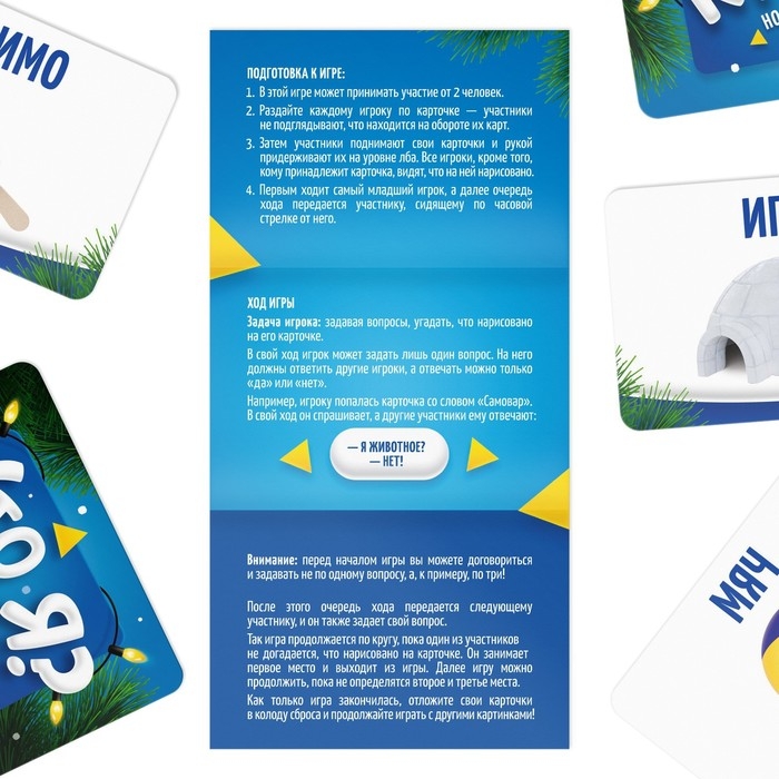 Перед вами новая версия популярной игры «Кто я?» — здесь помимо слов на карточках нарисованы картинки, чтобы играть могли даже те, кто не умеет читать! Задавайте вопросы, угадывайте, что изображено на вашей карте, и весело встречайте Новый год!