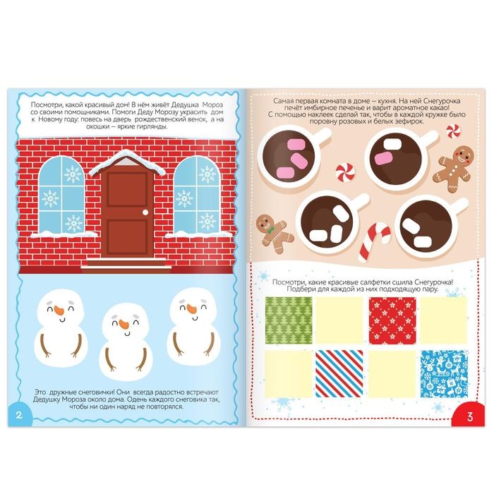 - Внутри ребёнок найдёт интересные задания: ему предстоит наряжать ёлку и решать много других увлекательных задачек с помощью наклеек.