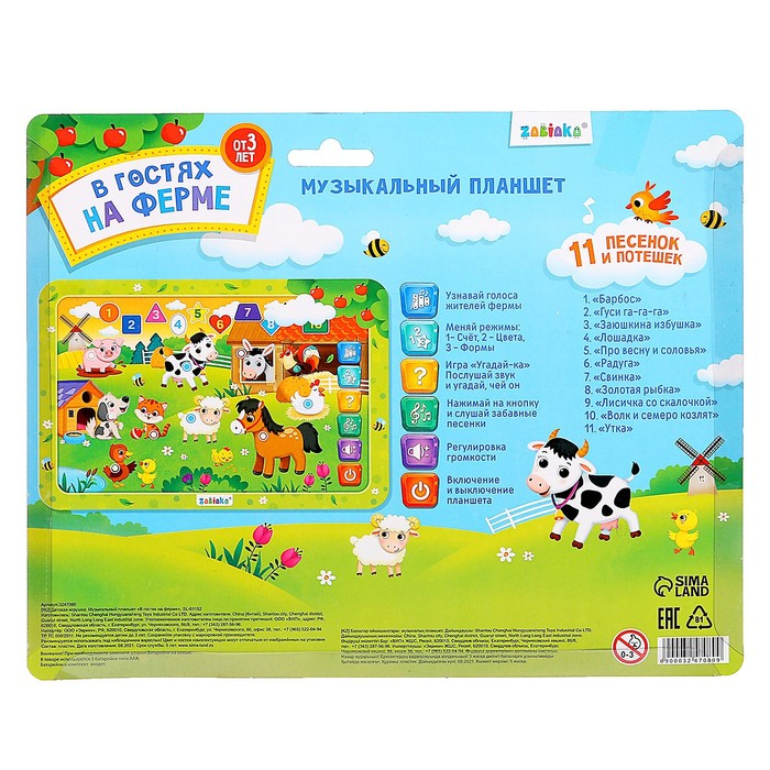 Обучающий планшет «Моя ферма» поможет детям в игровой форме познакомиться с животными фермы, узнать, как они выглядят и говорят. Малыша ждут известные песенки и потешки, буквы, цифры, цвета. Ребёнок научится считать и правильно произносить слова.