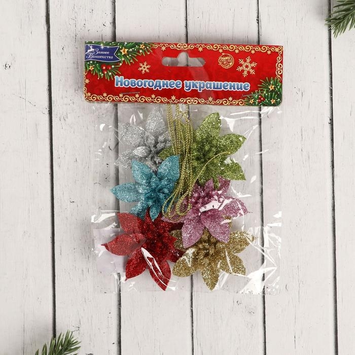 Украшение ёлочное "Цветы пышные - блеск" (набор 6 шт) 5х5 см, микс