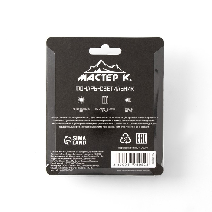 Фонарь-светильник "Мастер К", COB, 3 ААА, магнит, клейкая основа, 11.2 х 7.5 х 3.5 см