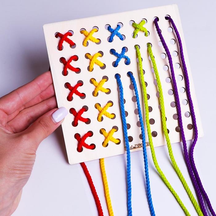- Продевая шнурок через отверстия, малыш тренирует мелкие мышцы рук, что важно для подготовки к письму и рисованию, при этом стимулируя мелкую моторику рук.