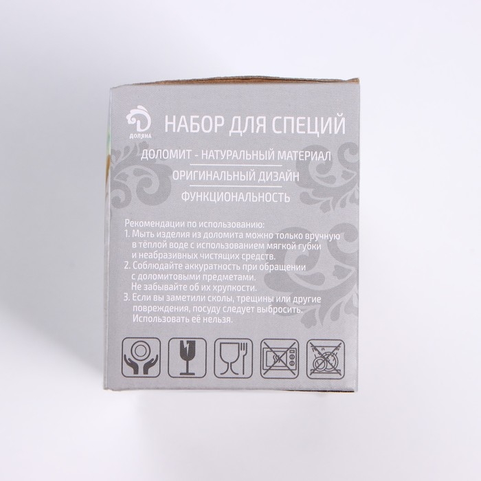 Набор для специй Доляна «Зайка» изготовлен из качественного доломита. Благодаря нежному дизайну изделие легко украсит вашу кухню, а также прекрасно подойдёт в качестве подарка.
