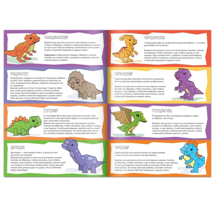 В ней ребёнок найдёт целых 8 фигурок динозавров, которые нужно собрать из бумаги. Малышу предстоит вырезать детали и склеить их между собой.