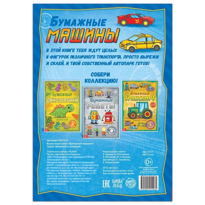 Книга-вырезалка «Бумажные машины», 8 поделок, 20 стр., формат А4