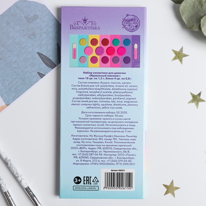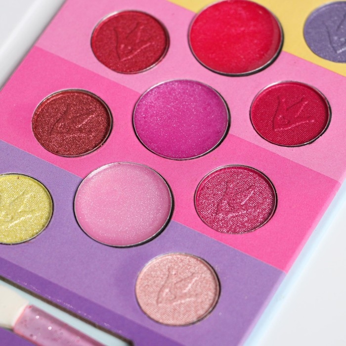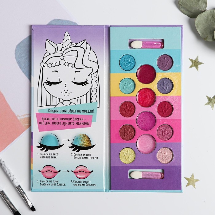 В состав набора входит 10 теней (вес – по 1,3 г) и 4 блеска (вес – по 0,8 г) разных оттенков, и такой набор косметики для макияжа будет отличным сюрпризом для маленьких принцесс!