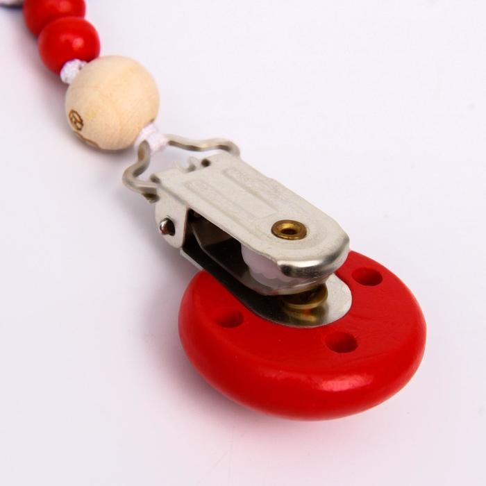 Изделие фиксируется на одежде ребёнка. На конце цепочки есть карабин, который зацепляется за кольцо пустышки. Надёжное крепление убережёт вещь от падения на пол, если малютка случайно выронит её изо рта.