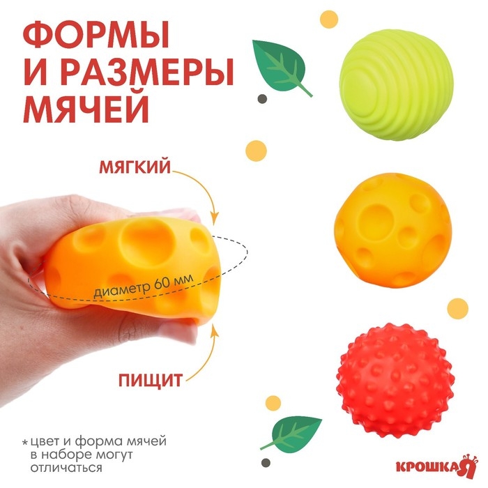 Набор развивающих тактильных мячиков «Лисенок Лёлик», с пищалкой, 3 шт, Крошка Я