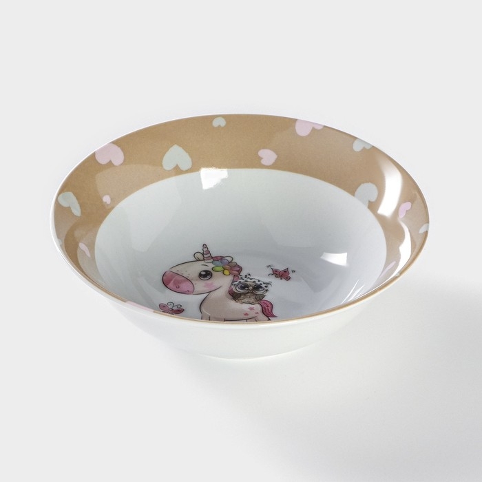 Тарелка керамическая глубокая Доляна «Совёнок и единорог», 400 мл, d=15 см, цвет белый