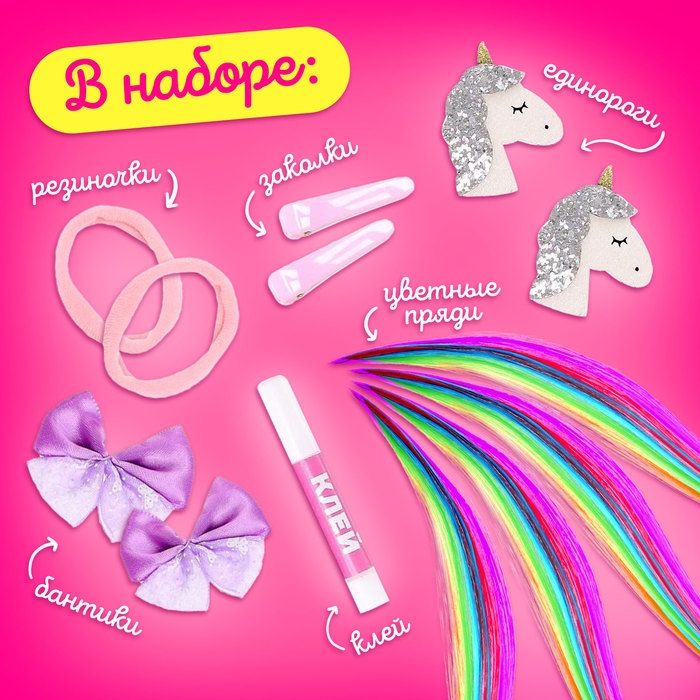 В комплекте есть всё необходимое для этого: основы для заколок, резинки для волос, декор, цветные прядки.