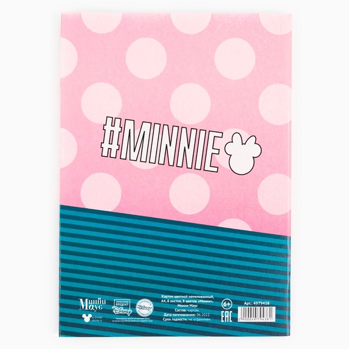 Картон цветной, А4, 8 листов, 8 цветов, немелованный, односторонний, в папке, 220 г/м², Минни Маус
