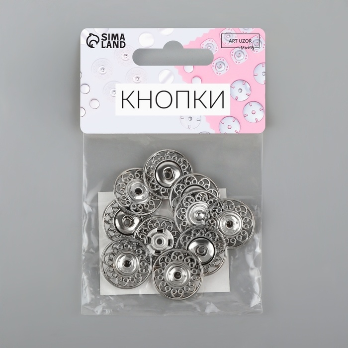 В наборе пять кнопок, d = 21 мм, цвет серебряный.