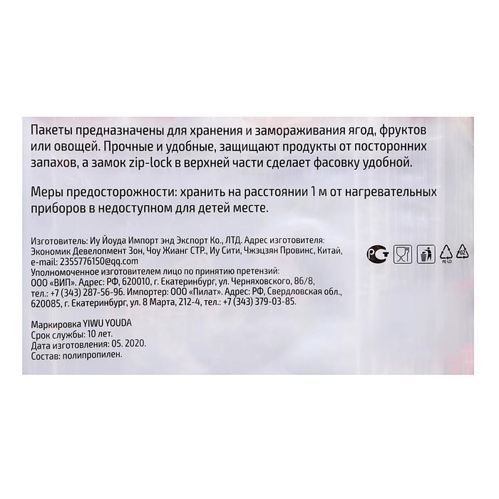Пакеты предназначены для хранения и замораживания ягод, фруктов или овощей. Прочные и удобные, защищают продукты от посторонний запахов, а замок zip-lock в верхней части сделает фасовку удобной.