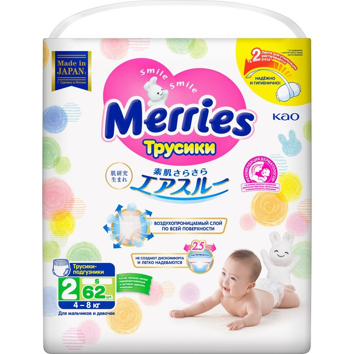 Подгузники-трусики Merries S 4-8 кг, 62 шт.