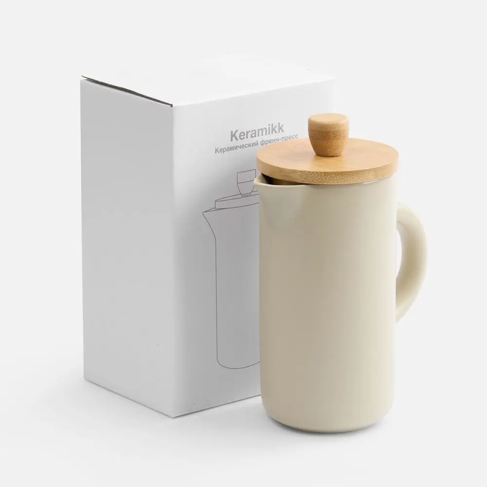 Френч-пресс Keramikk выполнен из керамики, благодаря чему он хорошо сохраняет температуру напитка, не обжигает руки и прост в уходе. Контраст бамбуковой крышки и керамики выглядит действительно интересно и необычно.Емкость 350 мл.
