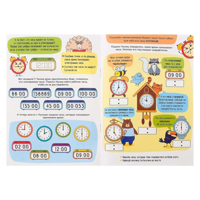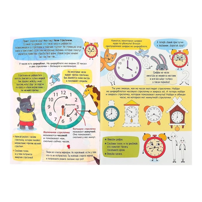 Научите малыша правильно пользоваться часами! С помощью этой книги ребёнок узнает, что такое часы и циферблат, познакомится со стрелками и понятием «сутки», а самое главное — научится определять время.