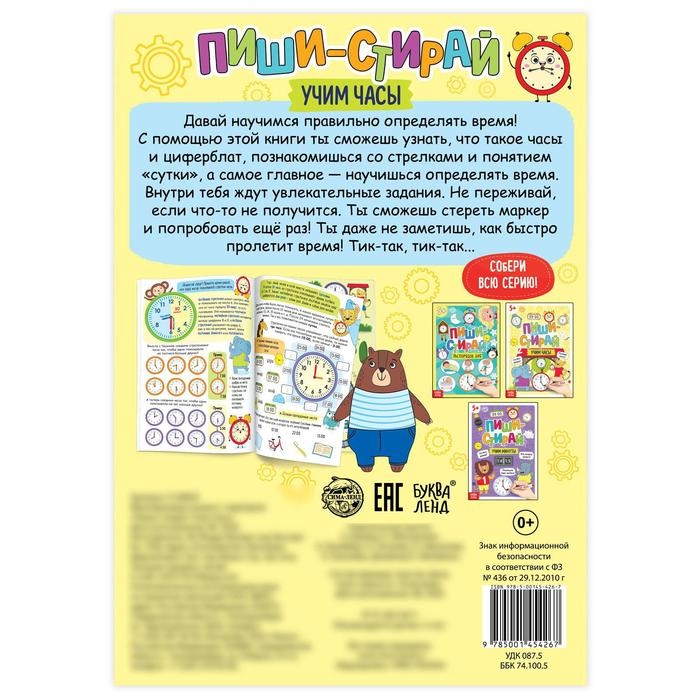 Многоразовая книжка «Пиши- стирай. Учим часы», 12 стр.