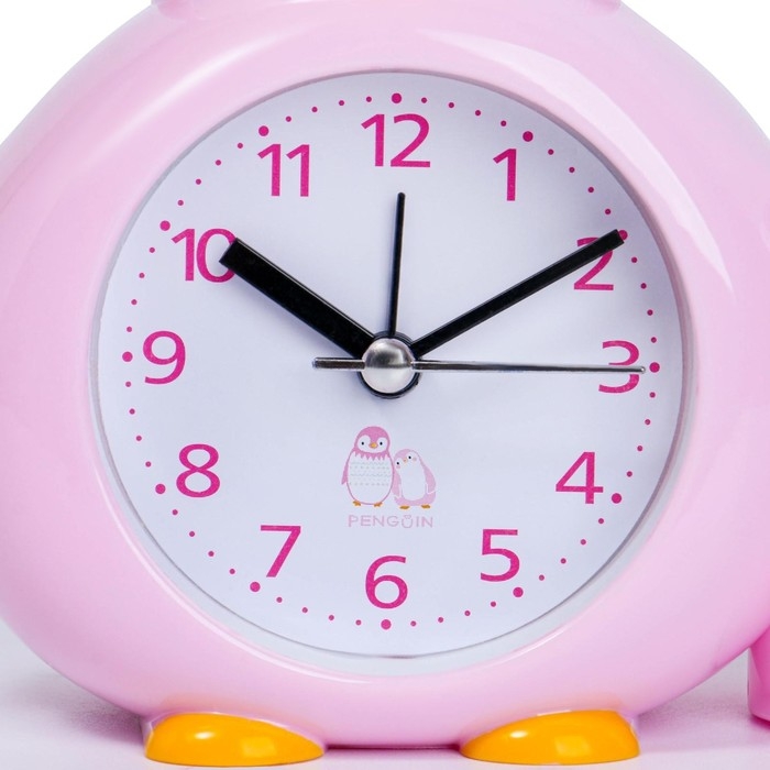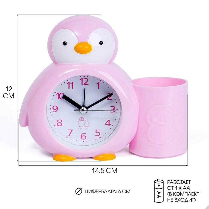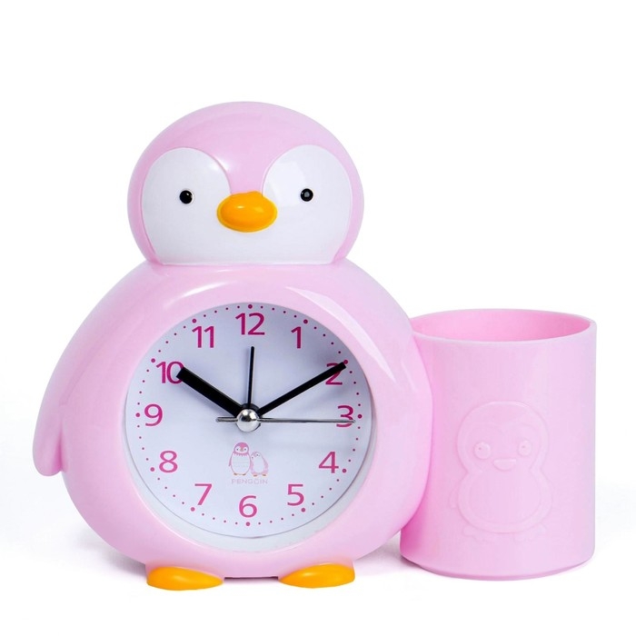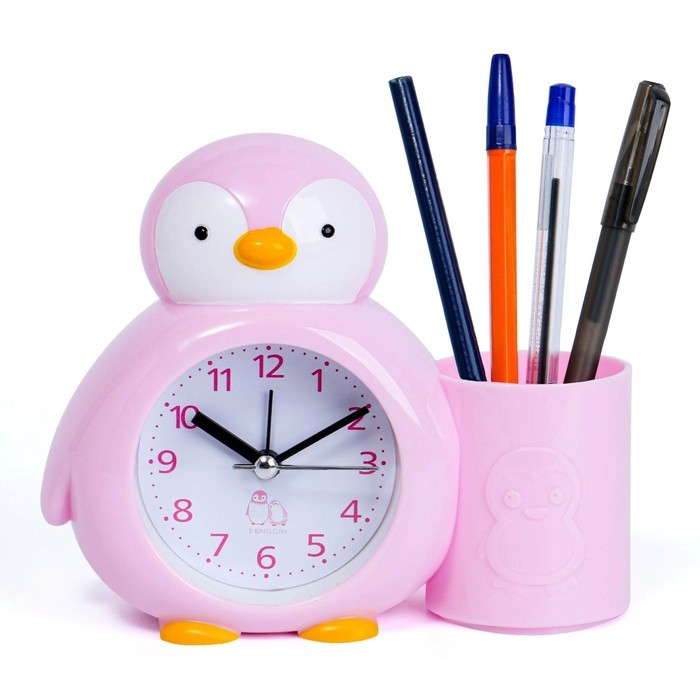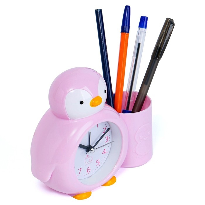 Будильник "Пингвинёнок", с карандашницей, дискретный ход, d-6 см, 12 х 14.5 см, розовый