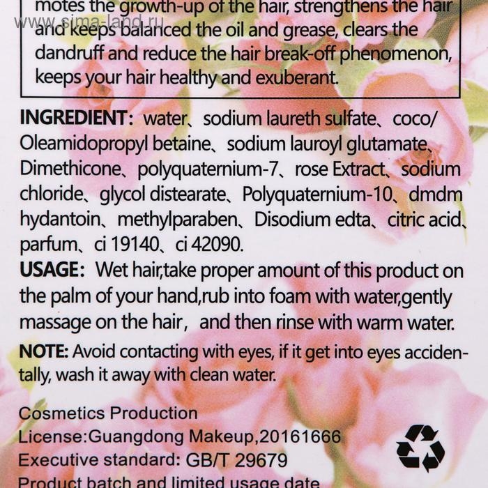Входящий в состав шампуня экстракт розы, глубоко питает, укрепляет и увлажняет волосы. Натуральные компоненты состава уменьшают выпадение волос.