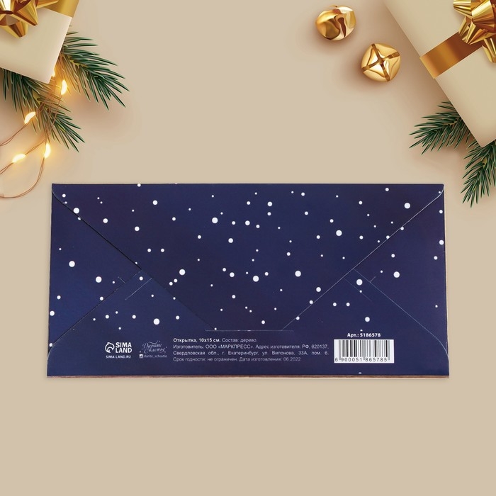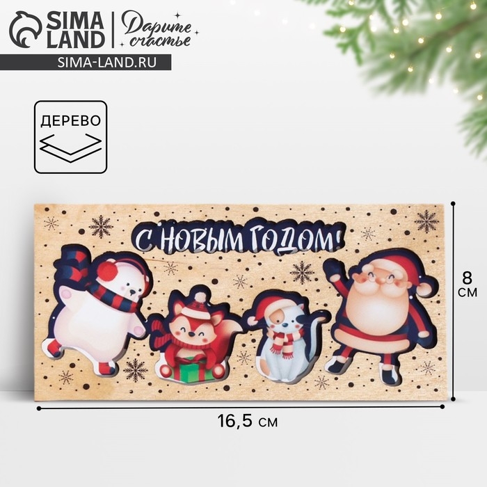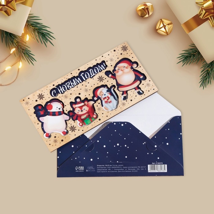 Конверт для денег деревянный резной "С Новым Годом!" персонажи, 16,5 х 8см, Новый год