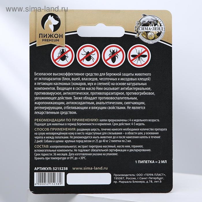 БИО капли от паразитов для животных "Пижон Premium" для щенков и собак крупных пород, 25-40кг, 2 х2м