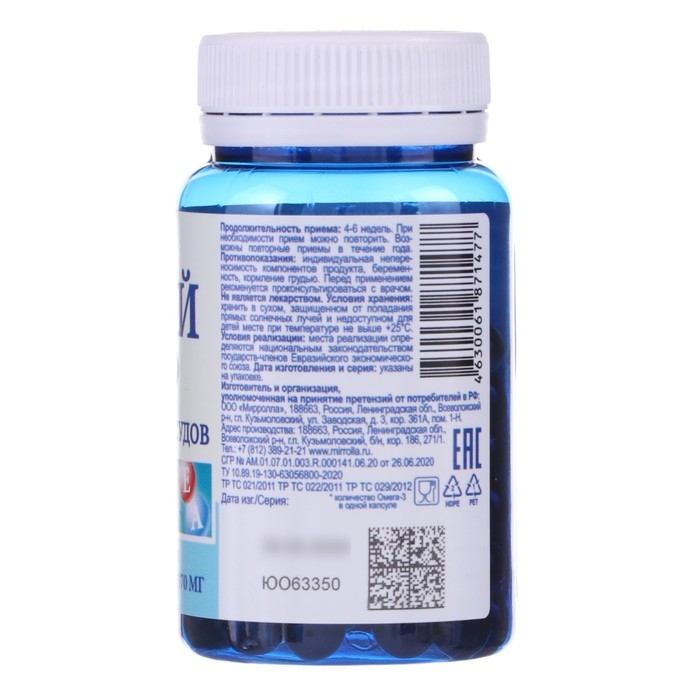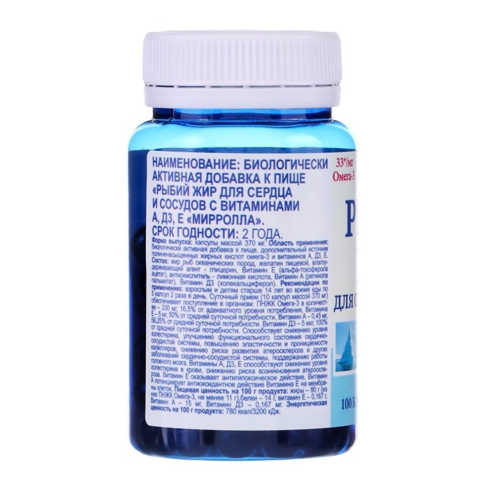 Рыбий жир «Мирролла», для сердца и сосудов с витаминами А, Д3, Е, 100 капсул по 370 мг