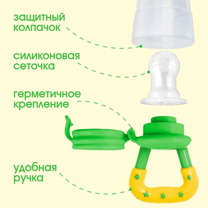 Изделие для прикорма (ниблер) пригодится в период, когда ребёнок переходит с кашки и молока на твёрдую пищу. Приспособление разовьёт у крохи жевательные навыки. Также предмет будет безопасно массировать дёсны во время прорезывания зубов.