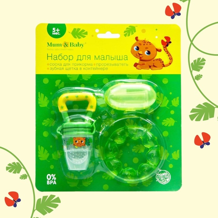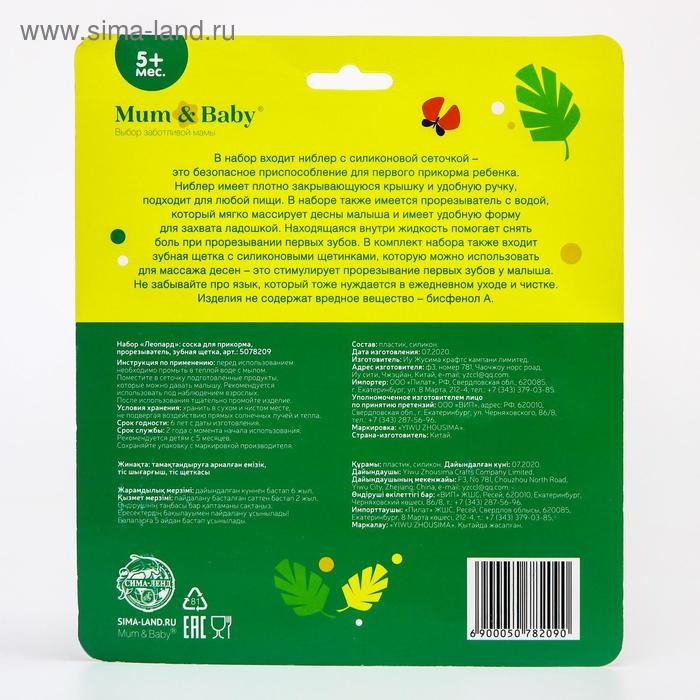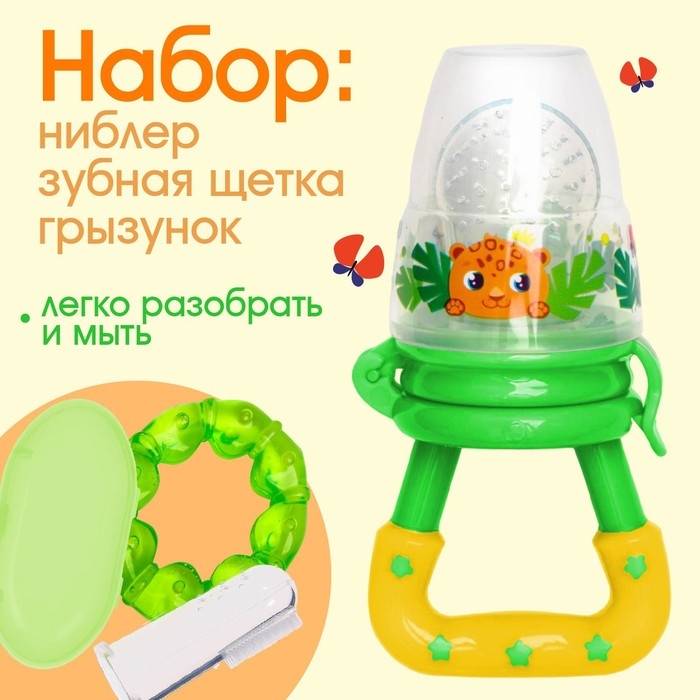 Набор: ниблер для прикорма с силиконовой сеточкой + силиконовая зубная щетка на палец в контейнере + силиконовый прорезыватель «Леопард»