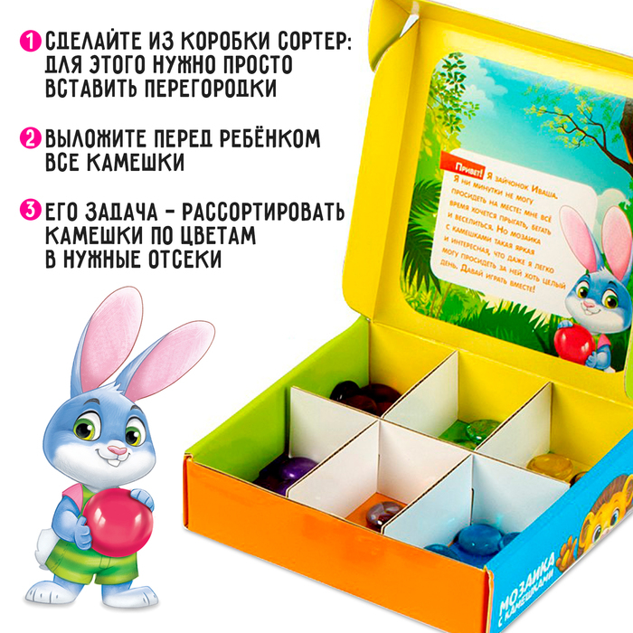 Коробку можно использовать как сортер, чтобы складывать камешки по цветам.